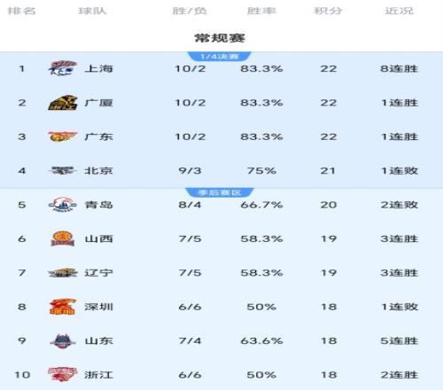 CBA常规赛第12轮结束了所有比赛,最新积分榜如下!