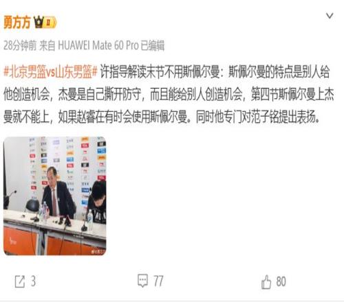许指导继续有什么说什么,这次他把不上斯佩尔曼的原因归结为赵睿缺阵,理由是斯佩尔曼没有自主进攻能力,需要赵睿来带动,赵睿打不了,第四节只能上单外援,所以只好上杰曼而不是斯佩尔曼,许指导这就有点甩锅了。