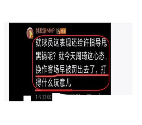 显然,付政浩认为北京队输球,周琦要负主要责任,进攻不给力,防守也不给力,特别是最后的时候,防守珀赛尔如果多向前一步,他可能就无法投进绝杀进球,而且,还不断骂骂咧咧,显然,周琦的糟糕表现坑惨了球队。