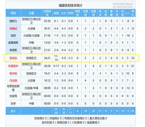 全场比赛,曾凌铉14投11中,其中,三分球9投9中,命中率达到了百分之百,砍下了33分2篮板2助攻2抢断的惊艳数据。其中,33分也是创造了他个人CBA职业生涯的得分新高,同时,投进9记三分球,也是他的一次新高。
