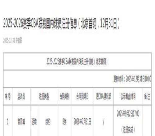 北京时间12月31日,CBA官方公布最新球员注册信息,曾凡博在今夏完成预注册后,如今终于正式完成注册,他将在2026年1月1日对阵广东的焦点京粤大战,迎来回归的正式首秀。