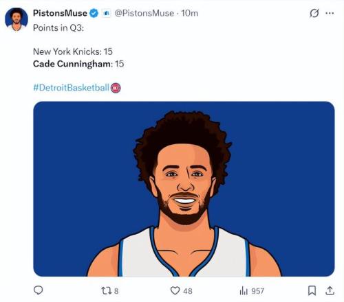 第二节坎宁安的轮换阶段他的发挥不多,但全队的士气已经起来了,这一节活塞单节净胜9分,第三节才是CC发挥的节次,他10分钟里8中5+三分2中2拿到15分2助攻1篮板1盖帽,尼克斯全队第三节才15分。