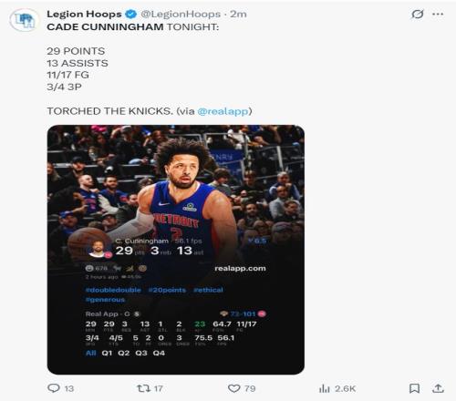 三节打完坎宁安17中11,三分4中3,拿到29分9助攻3篮板1抢断2盖帽。比克斯塔夫为了在末节开场就锁定胜局让CC继续打,坎宁安登场连续送了4个助攻直接帮助球队打出12-4收下比赛,尼克斯这边换下唐斯放弃比赛。