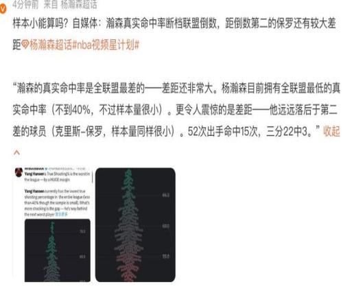 除此之外,他和倒数第二的老将保罗差距也是非常大,也意味着杨瀚森的数据表现非常难看。事情的真相到底是怎么样的,这位媒体在统计方面是不是存在着什么问题呢?