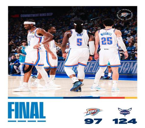 雷霆队,杰伦·威廉姆斯14中6得到了16分2板4助2断、霍姆格伦11中5得到15分6板2助、米切尔9中4得到11分3板2助3断、维金斯8中4得到11分2板2断2帽、肯里奇·威廉姆斯8分3板2助2断、以赛亚乔7中1得到5分4板1助2断、多尔特5分4板2帽、卡尔森3分5板、华莱士2分2板1助2断、扬布拉德1板。篮板数据上,OKC以34比52完败于对手。