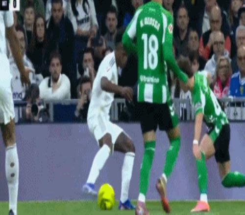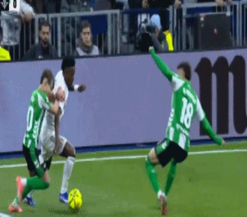 比赛的第5分钟,维尼修斯突入禁区左肋,在两名贝蒂斯球员的夹击下倒地,主裁判并未判罚点球。随后,视频助理裁判介入判罚,最终确认奥尔蒂斯并未犯规。