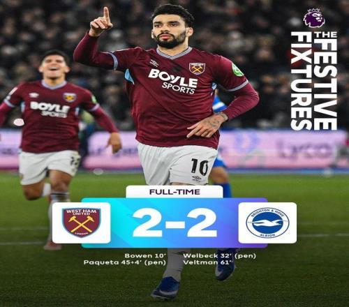 英超第19轮,西汉姆联主场2-2战平布莱顿,帕奎塔传射建功,这是帕奎塔英超生涯首次单场既有进球又有助攻。