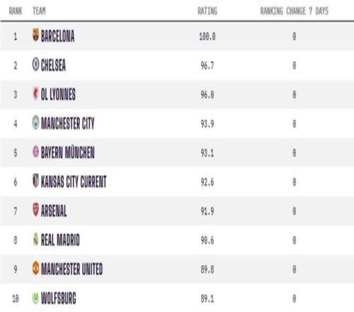 在本次排名中,巴塞罗那女足以满分100分的强势表现稳居世界第一。切尔西女足以96.7分位列第二,里昂女足以96.0分排名第三。