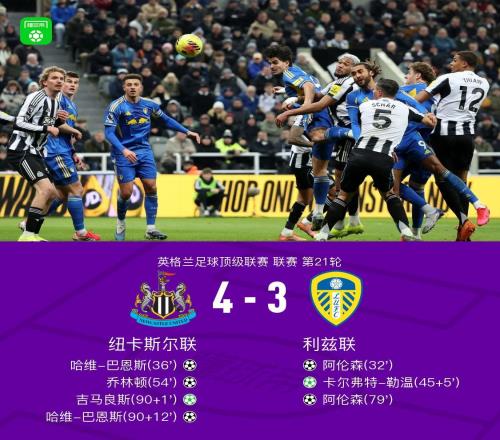 纽卡43利兹联,巴恩斯读秒绝杀+双响,阿伦森双响+送点,勒温、吉马良斯传射